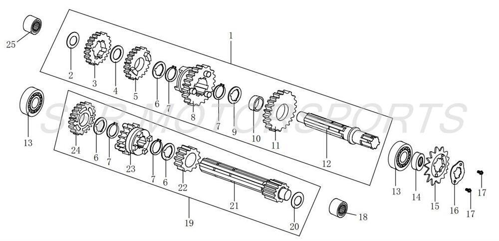 | 24 | A00211-17-00 | MAINSHAFT 4TH GEAR 23T | $14.00 | 1 |