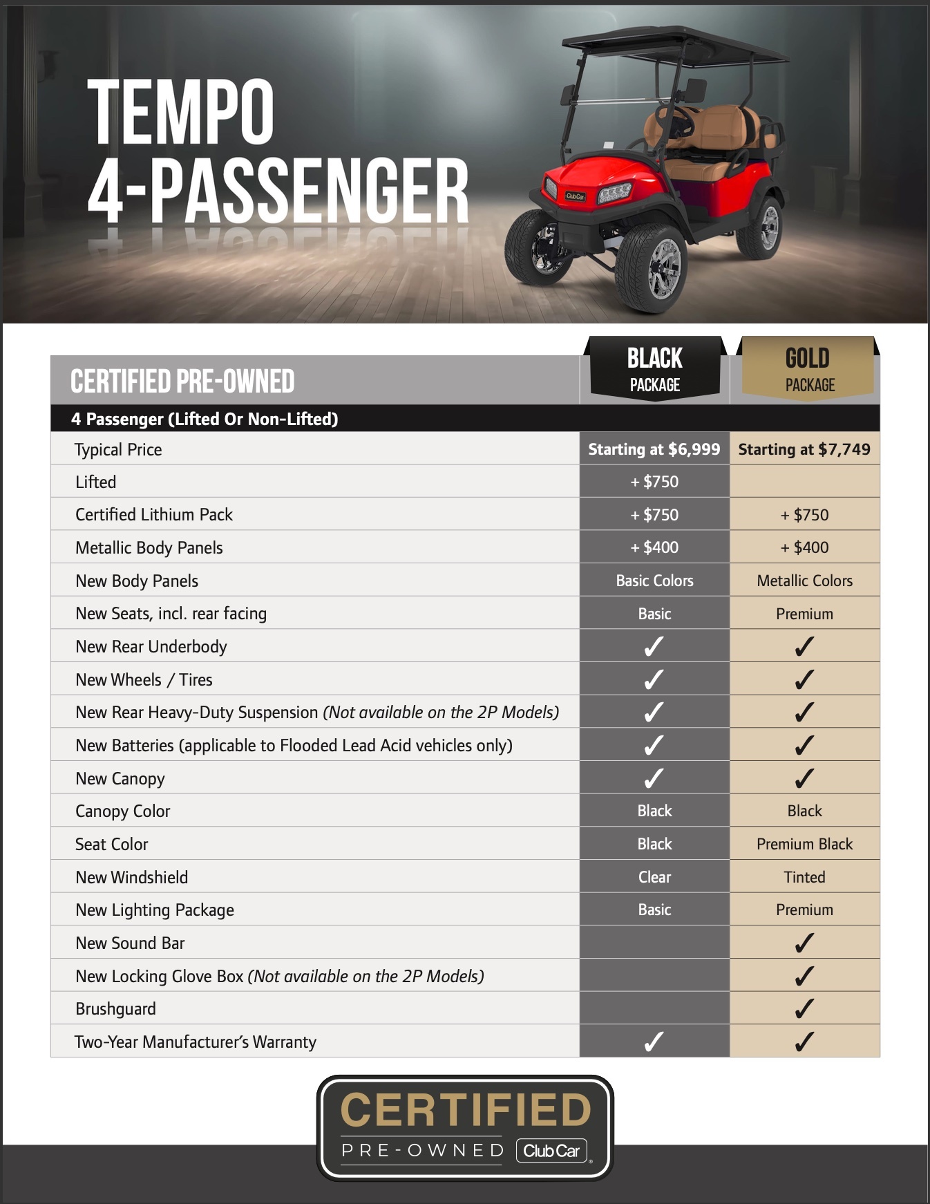 2026 Club Car Tempo 4 Passenger CPO Golf Cart | Lifted & Lithium Options | (GP)